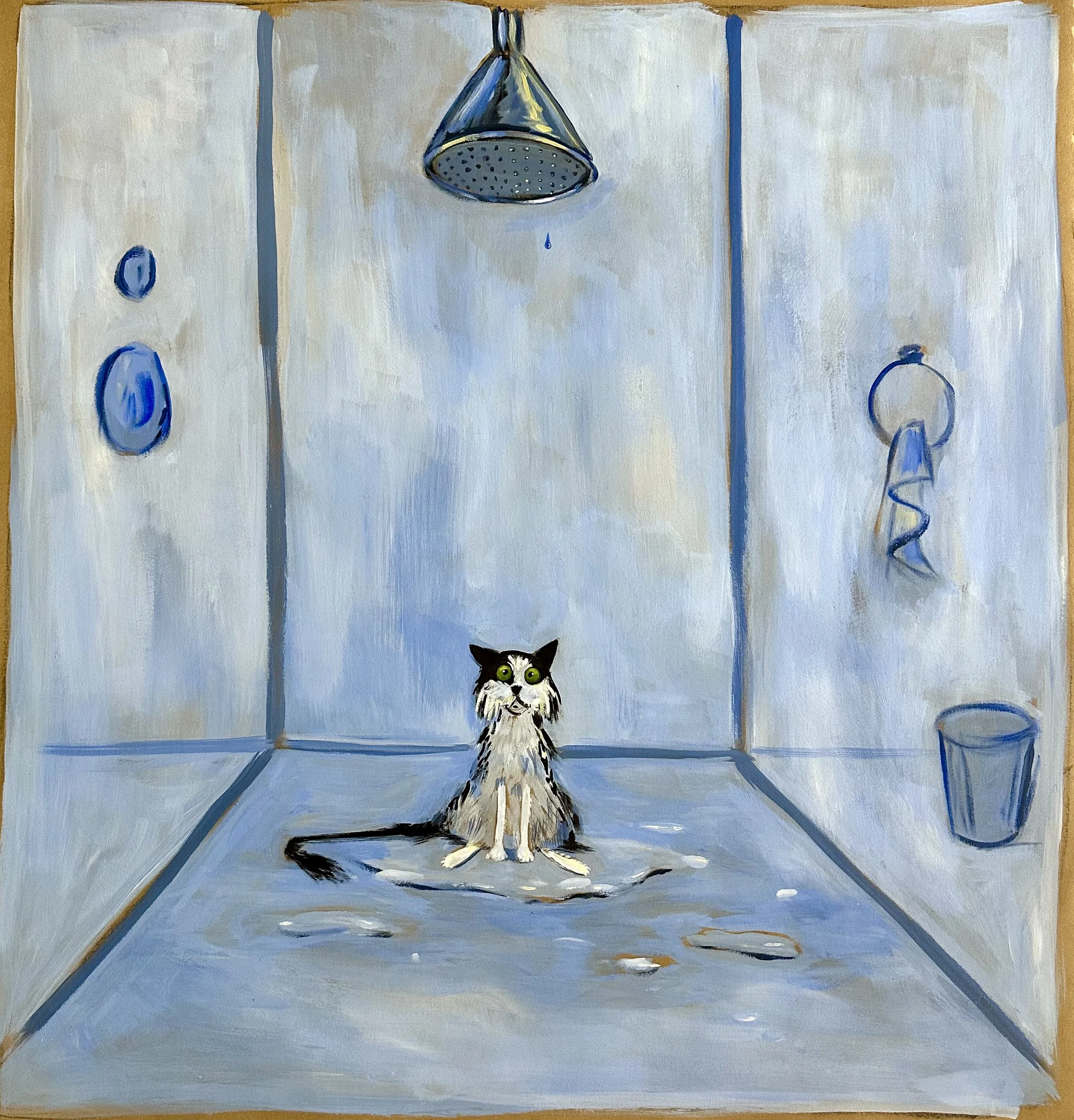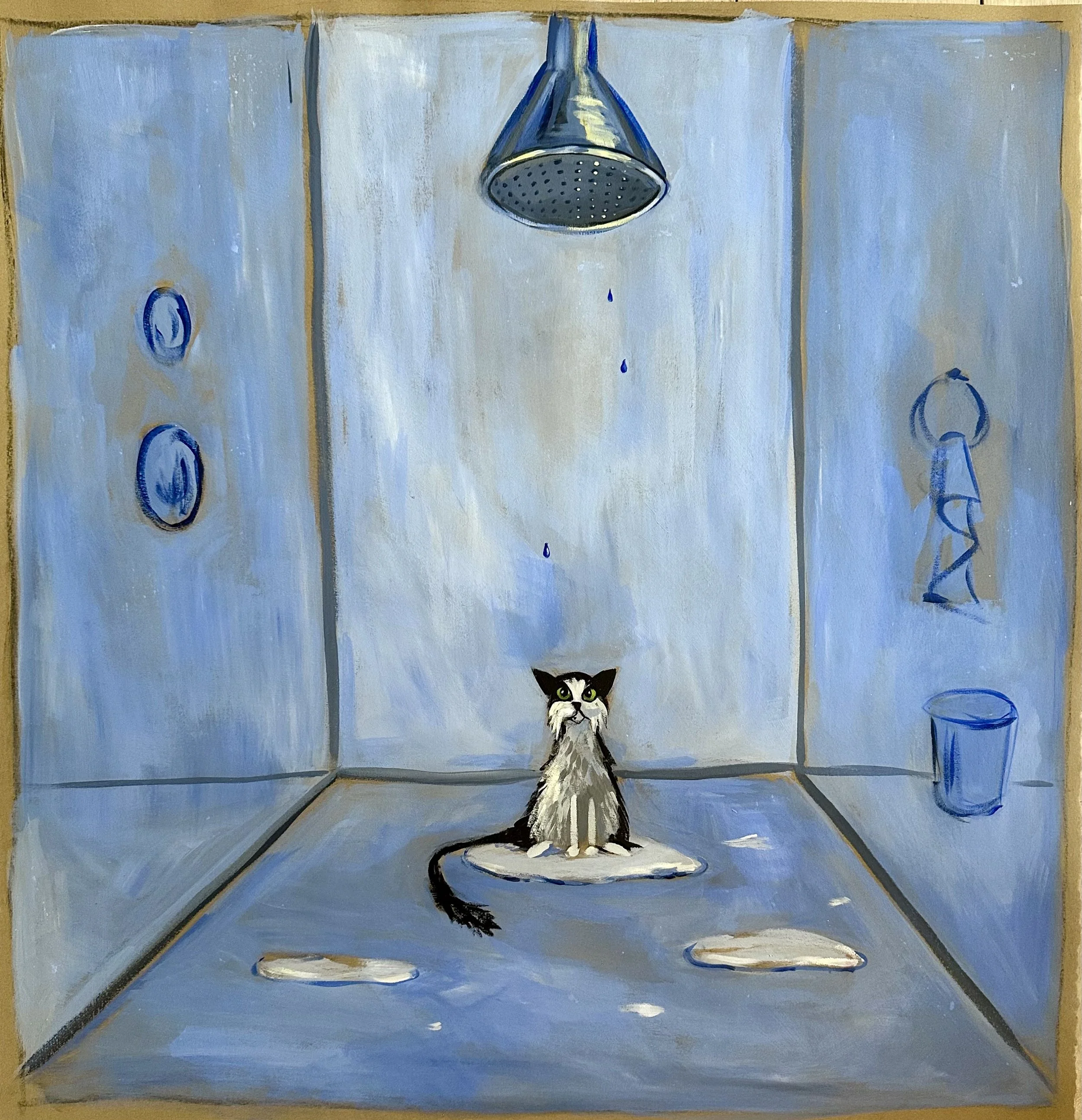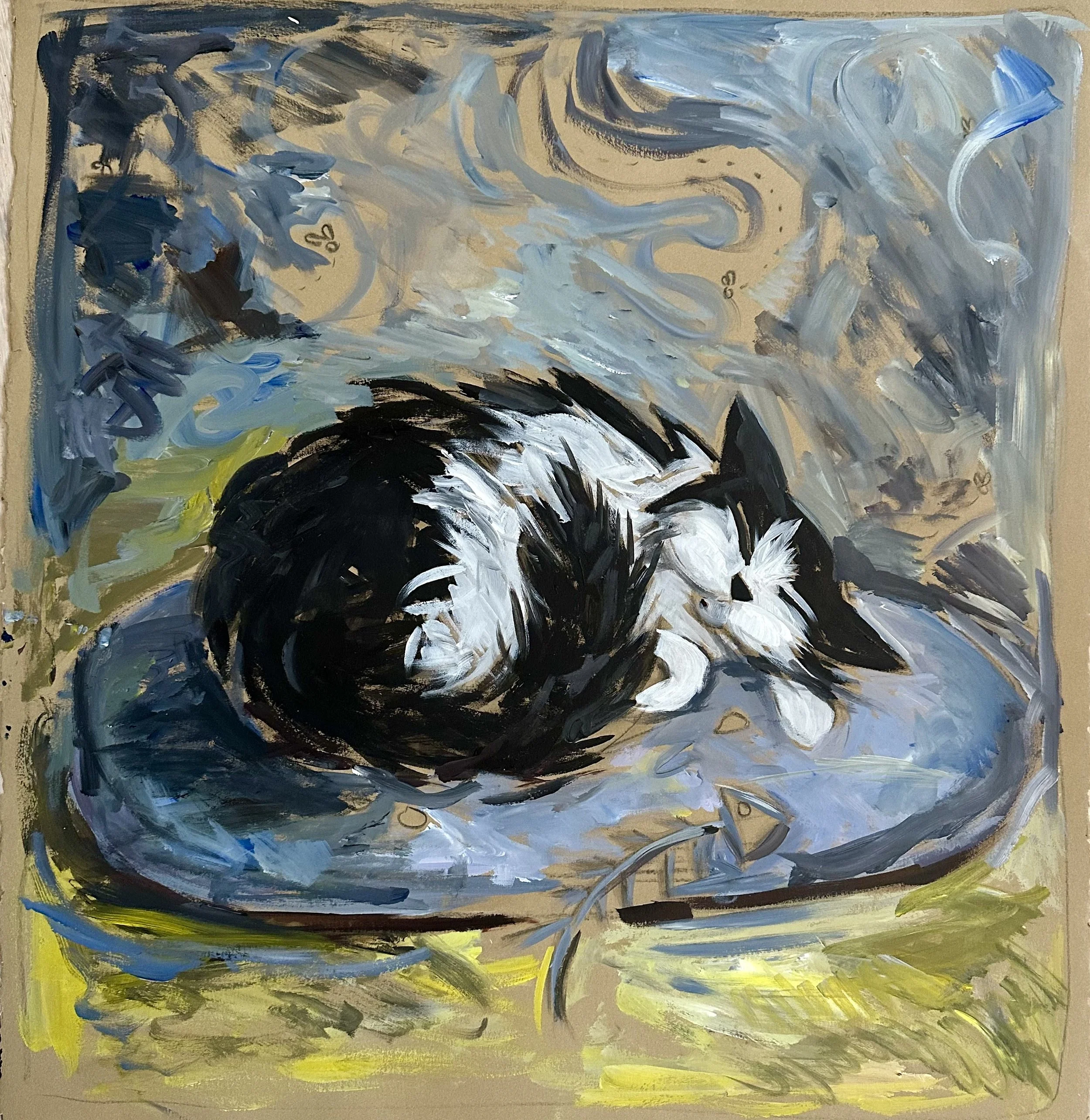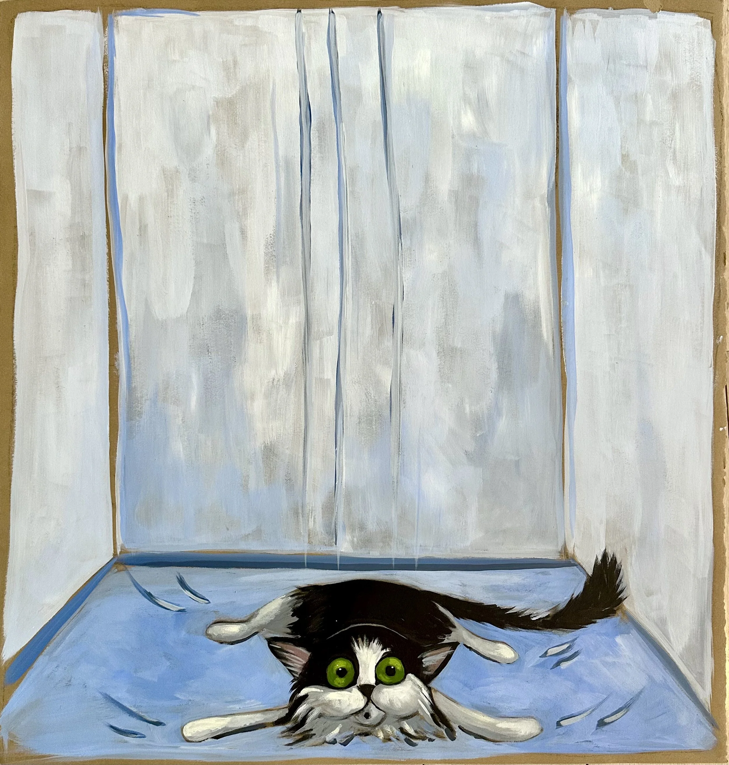 The works presented here include a selection of independent paintings, alongside the first eighteen paintings from an artist’s book currently in development. The pages contain a lighthearted metaphor, following Bingo as he confronts an unchosen and uncomfortable shift that ultimately leads him toward unforeseen contentment.