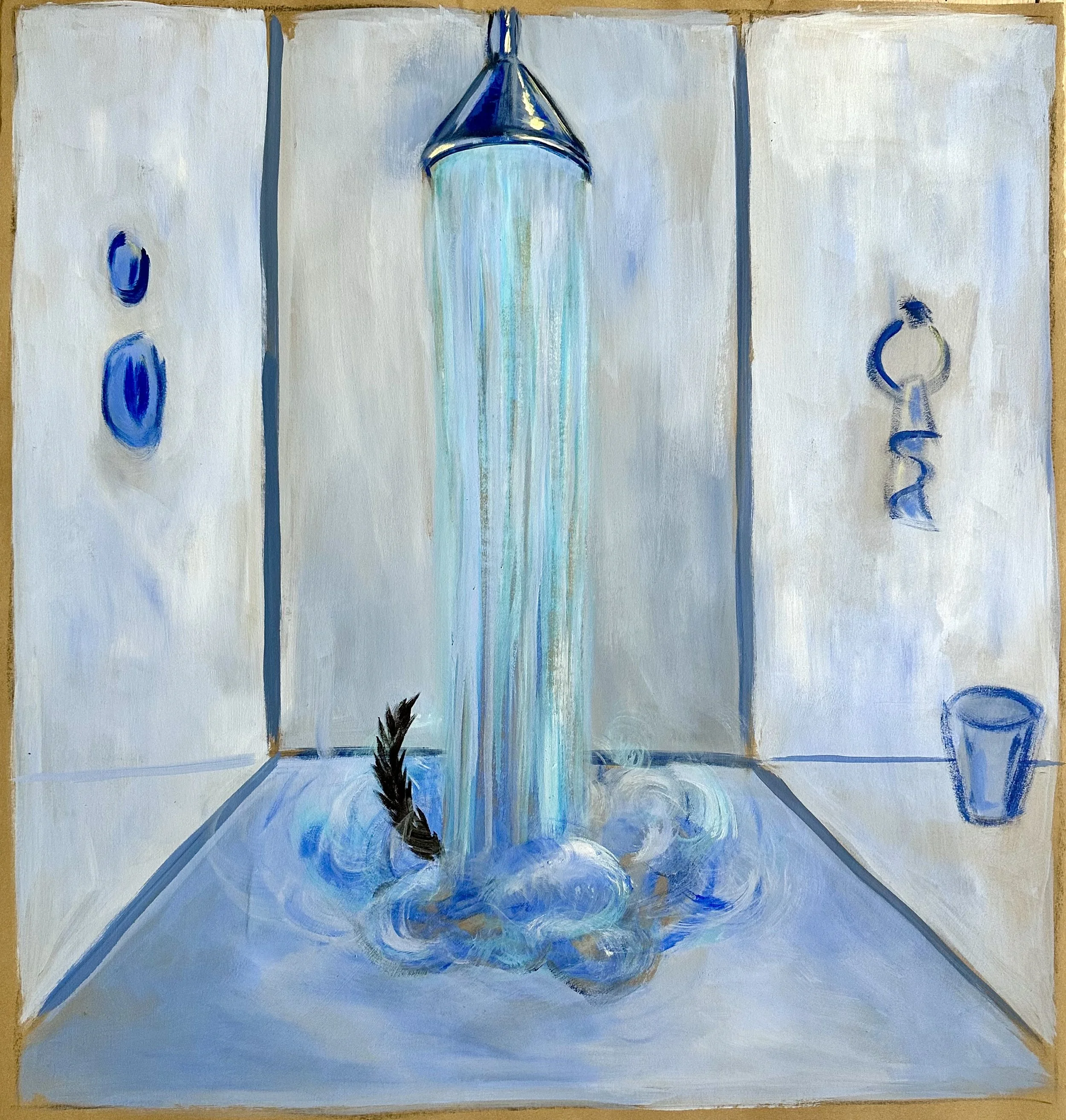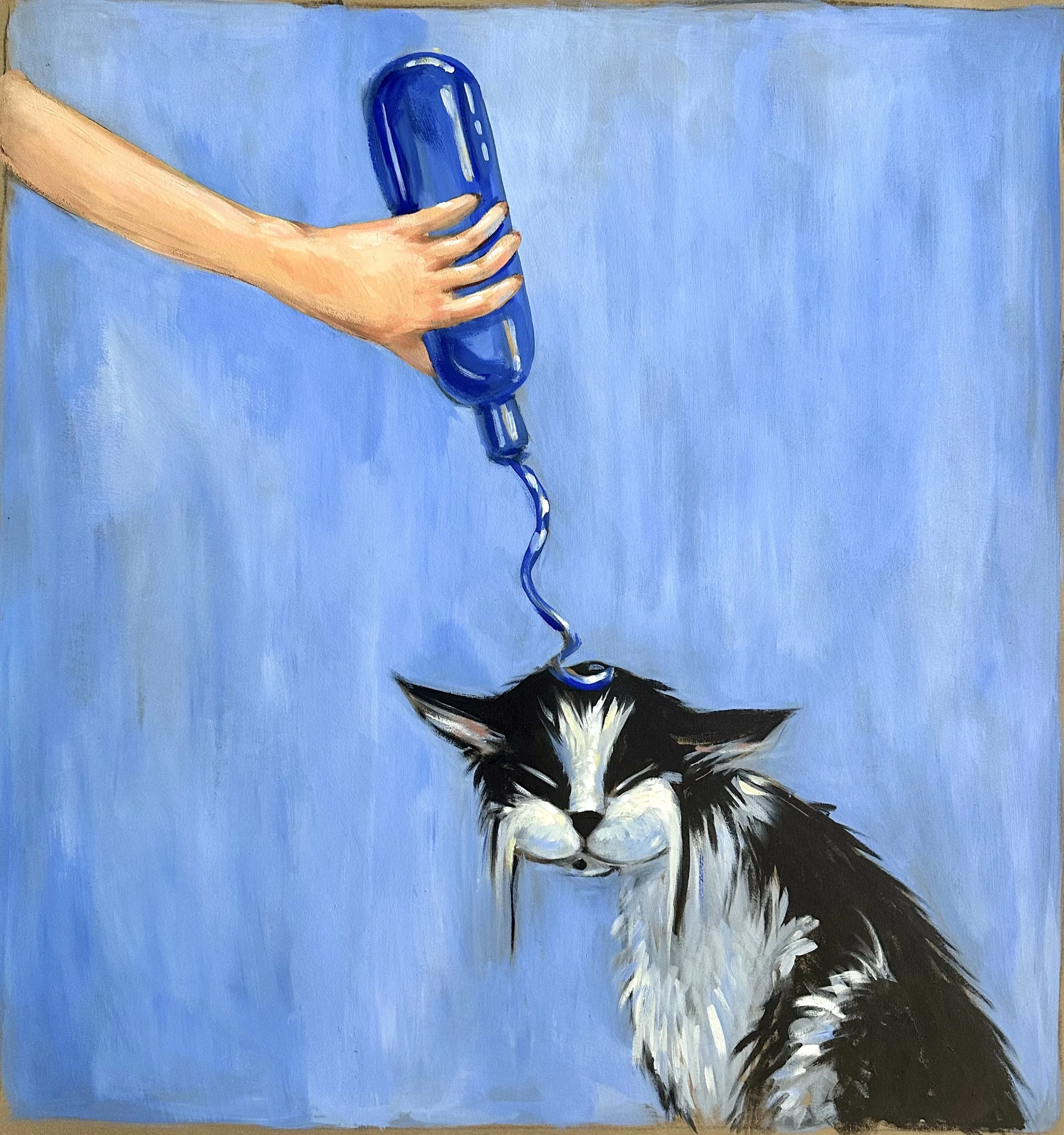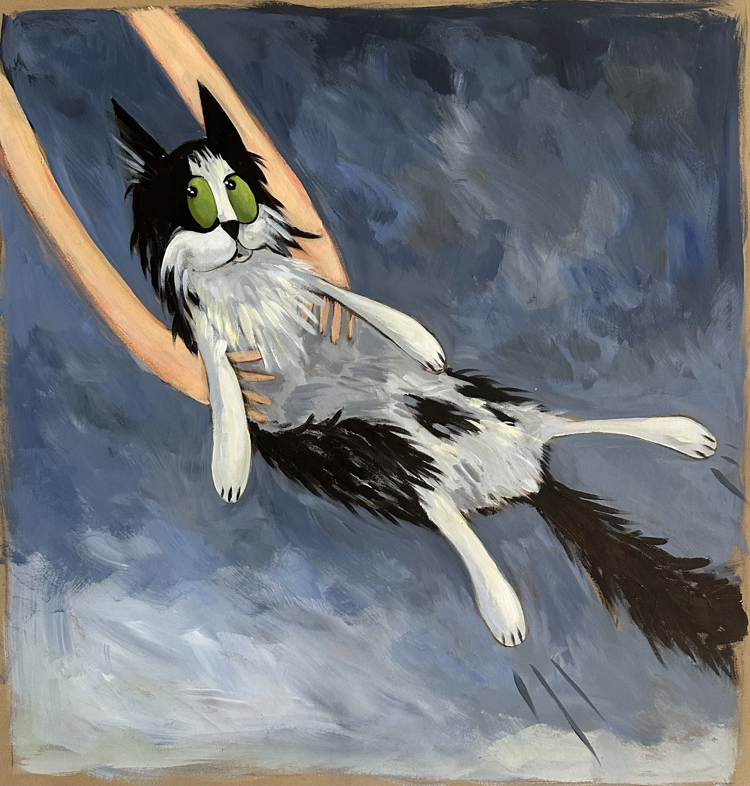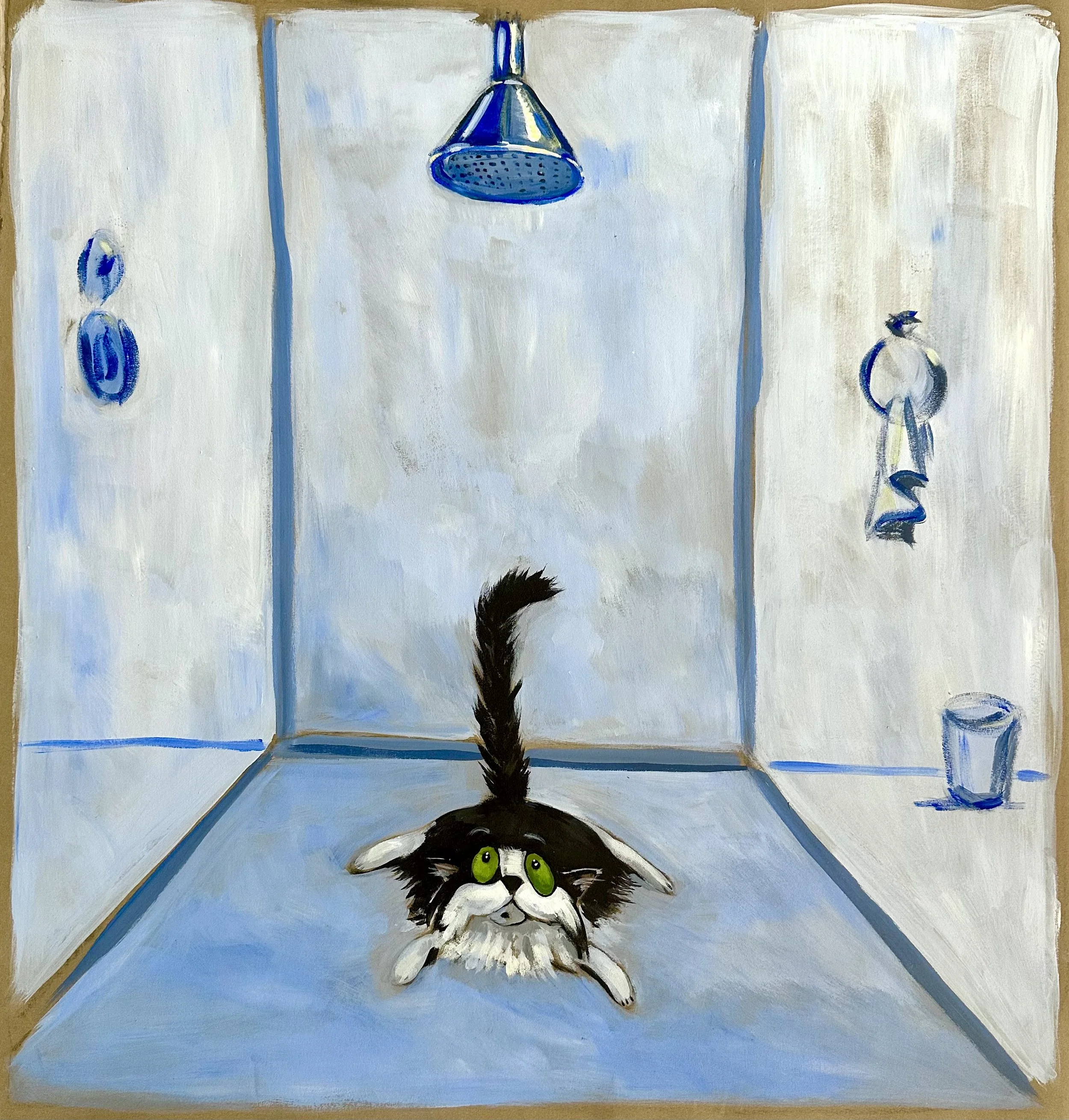 The works presented here include a selection of independent paintings, alongside the first eighteen paintings from an artist’s book currently in development. The pages contain a lighthearted metaphor, following Bingo as he confronts an unchosen and uncomfortable shift that ultimately leads him toward unforeseen contentment.
