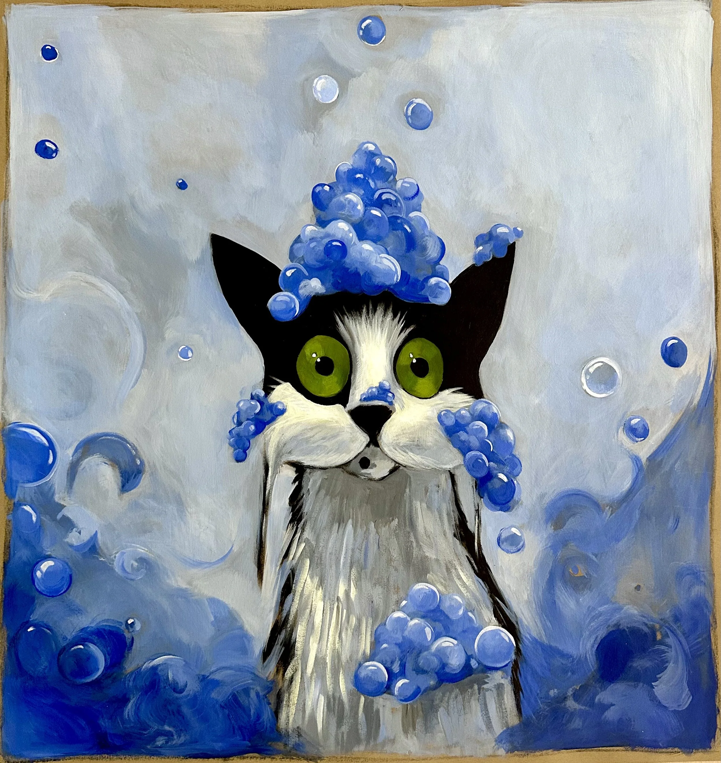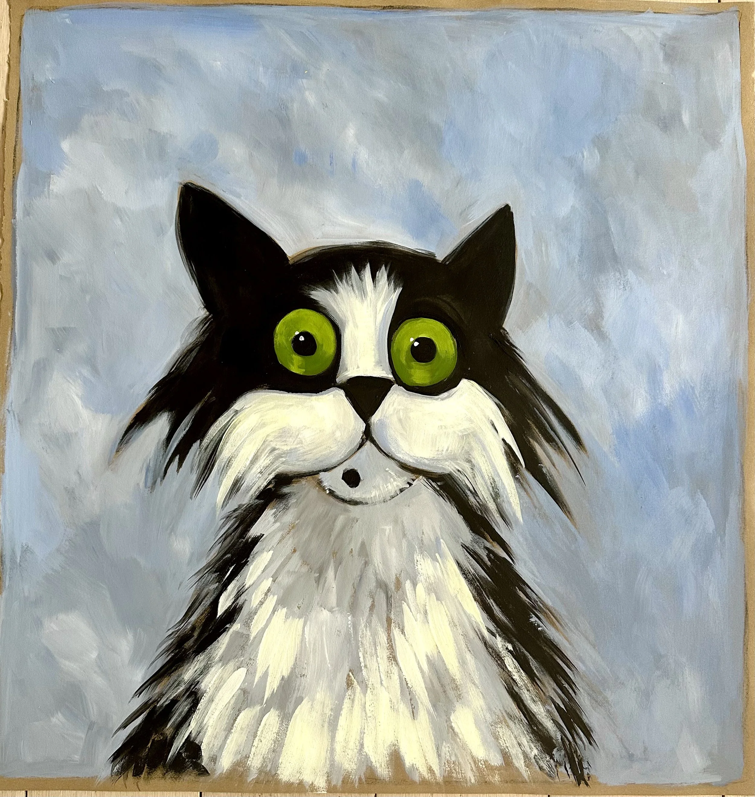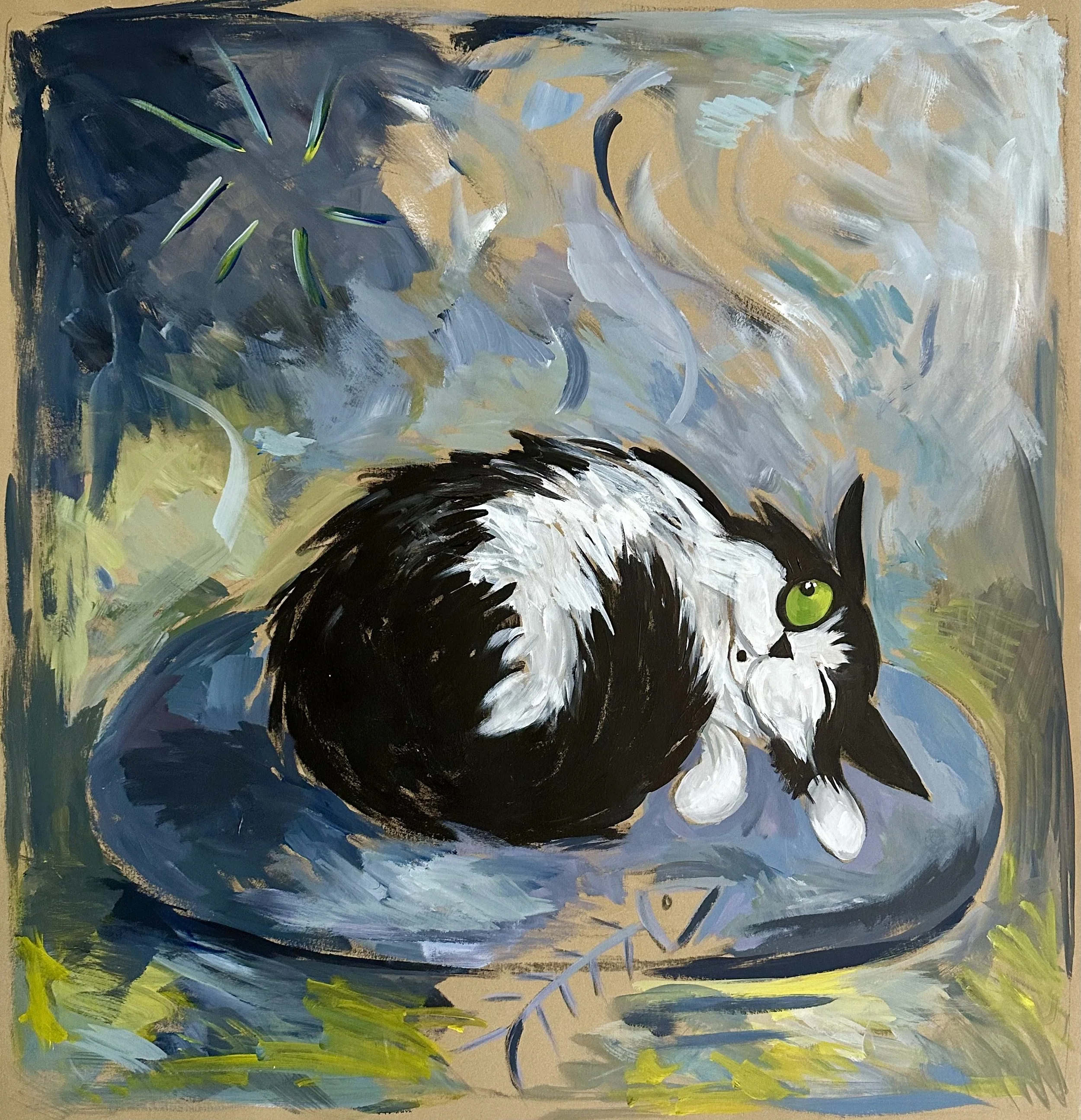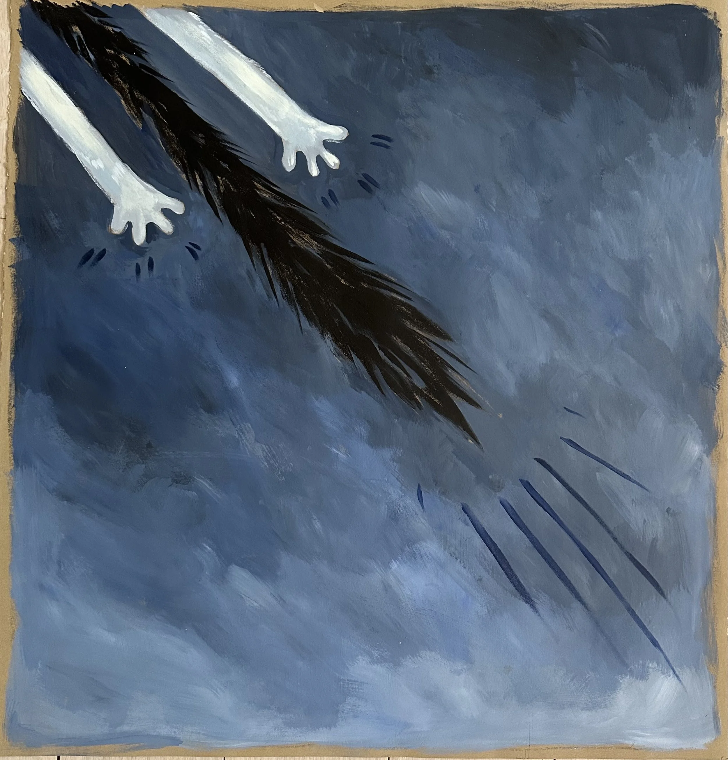 The works presented here include a selection of independent paintings, alongside the first eighteen paintings from an artist’s book currently in development. The pages contain a lighthearted metaphor, following Bingo as he confronts an unchosen and uncomfortable shift that ultimately leads him toward unforeseen contentment.