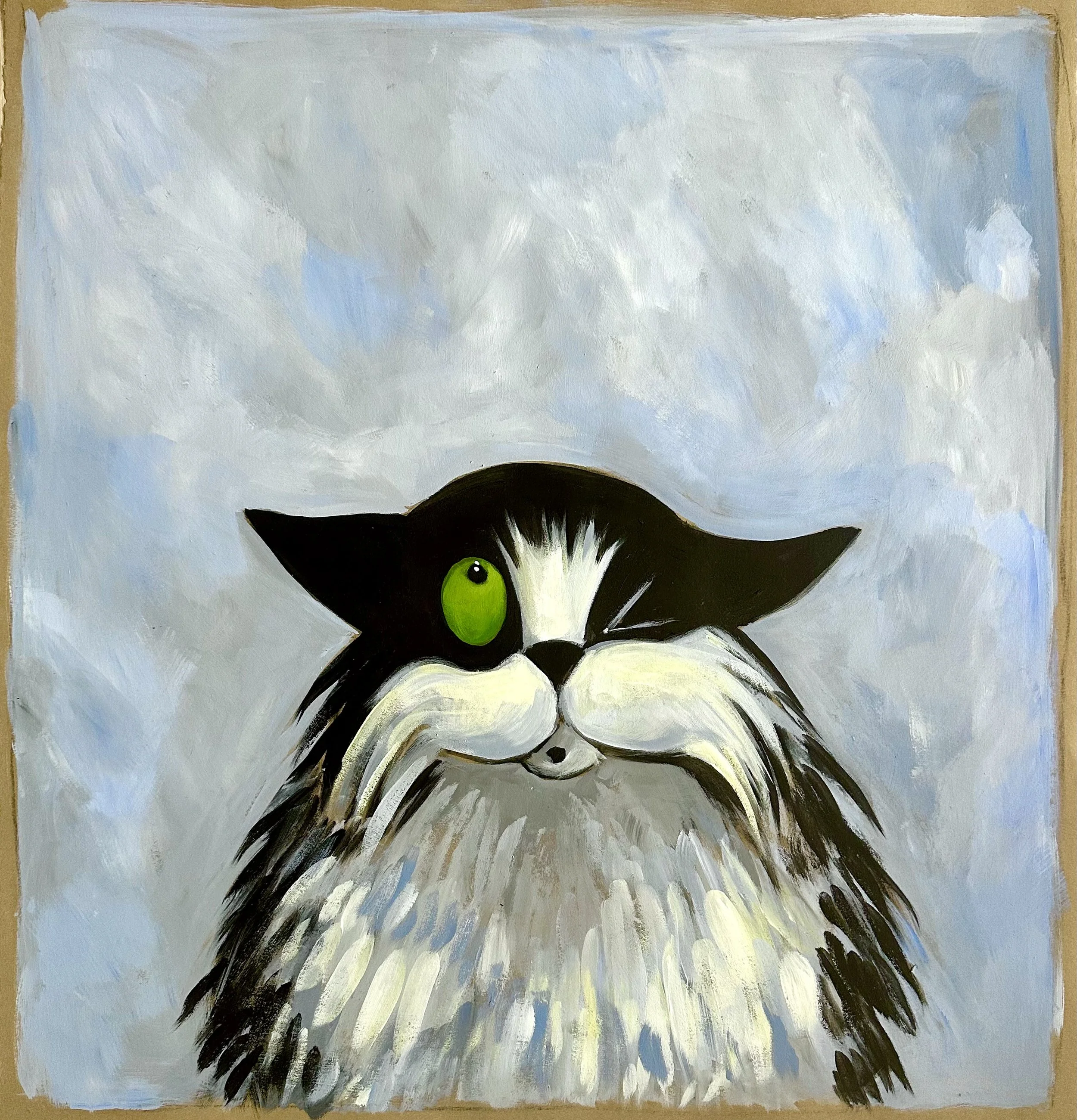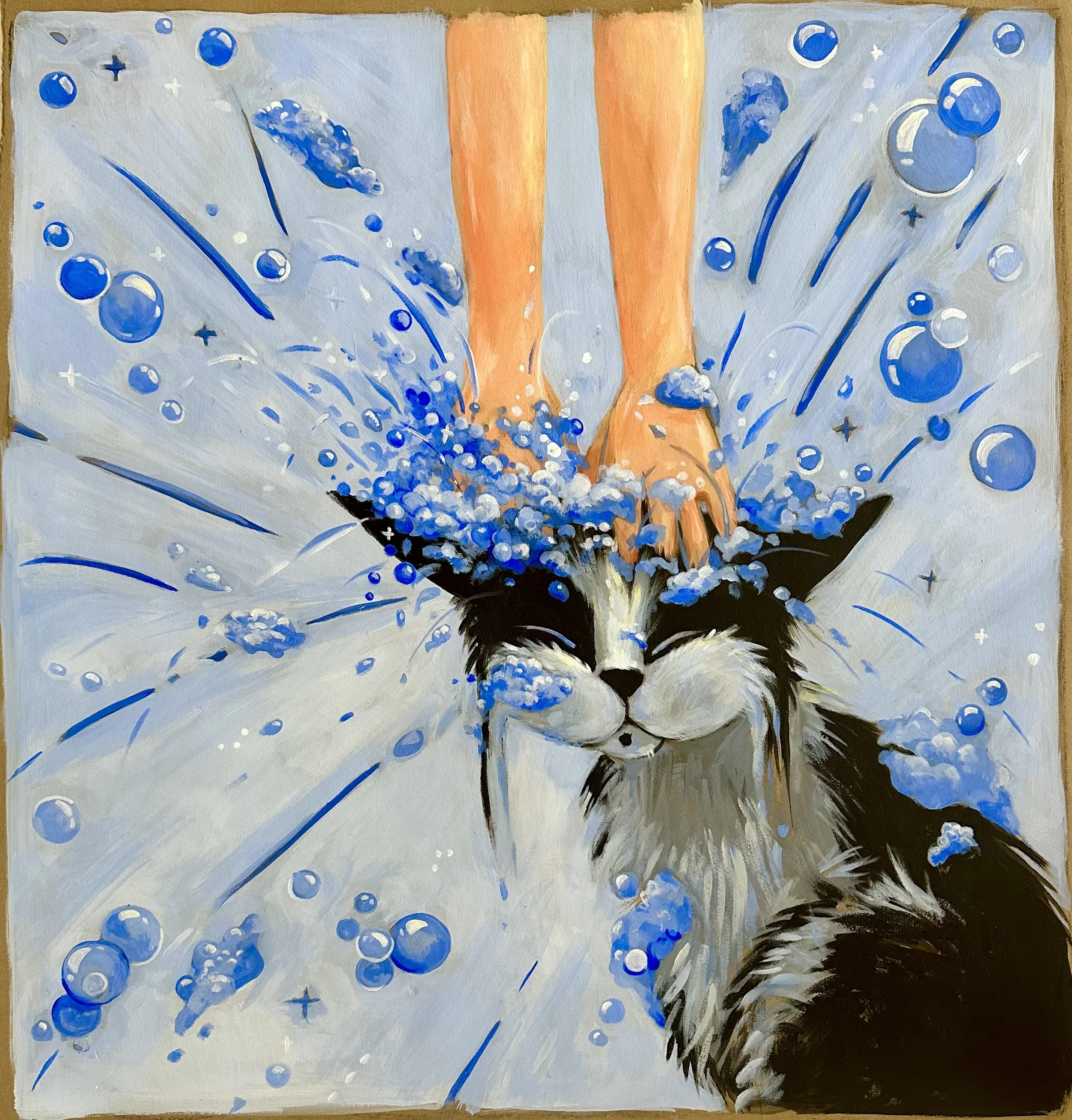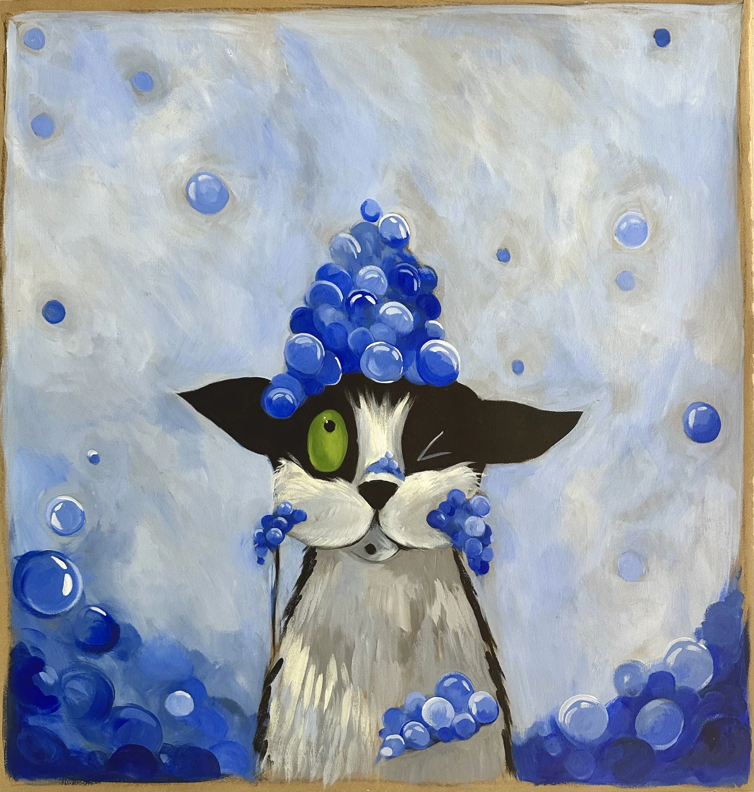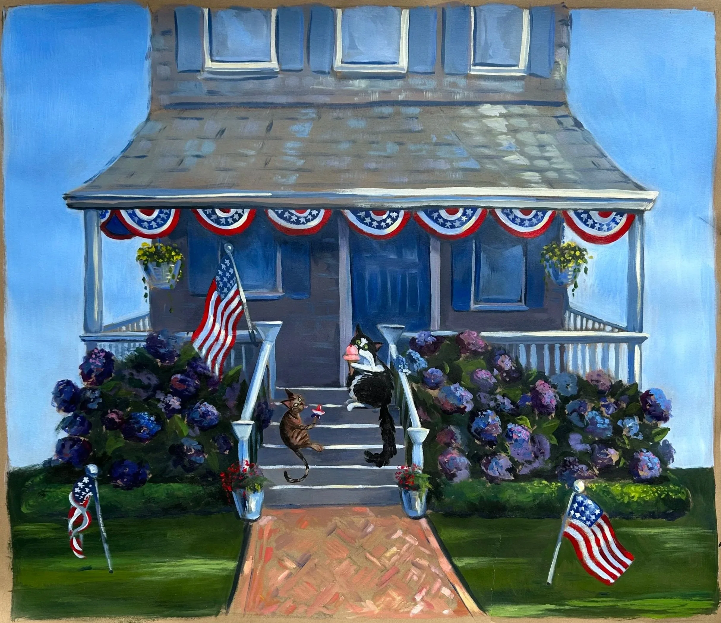The works presented here include a selection of independent paintings, alongside the first eighteen paintings from an artist’s book currently in development. The pages contain a lighthearted metaphor, following Bingo as he confronts an unchosen and uncomfortable shift that ultimately leads him toward unforeseen contentment.